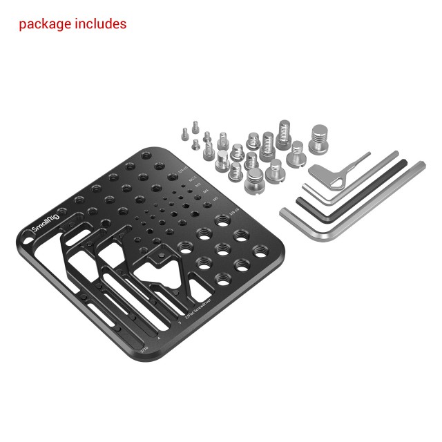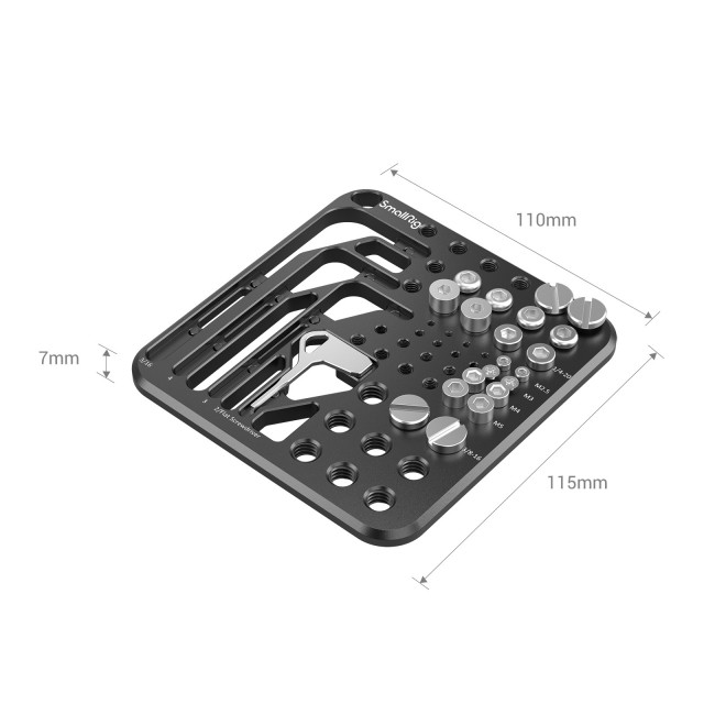 SmallRig MD3184 ploča za pohranjivanje vijaka i šesterokutnih ključeva dizajnirana je za najčešće korištene vijke i šesterokutne ključeve za kamere. Ovo je ploča za pohranjivanje koja sadrži 4 šesterokutna ključa (3/16、3、4、2/plosnati odvijač) i razne vijke, poput 2 1/4"-20 vijka s ravnom glavom, 8 1/4"-20 šesterokutnih vijaka za kavezi, L nosači, QR ploče, osnovne ploče, ručke, stezaljke šipki, gornje ploče i monitori, 2 x M4 šesterokutni vijci i 2 x M5 vijka, 2 x M3 upuštena vijka za montažu rozete, 2 x M2,5 šesterokutni vijci koji se koriste za kavez za zaključavanje protiv uvrtanja i 2 vijka s ravnom glavom 3/8"-16 za QR ploče i temeljne ploče. Zaštita od uvijanja postiže se držanjem šesterokutnih ključeva magnetom i montiranjem vijaka u rupe s navojem. Za prikladno i precizno pristupa, imaju jasne laserski ugravirane specifikacije marki. Ploča za pohranu dolazi s flanelom i otvorom za remen za jednostavno spremanje i prenosivost.
