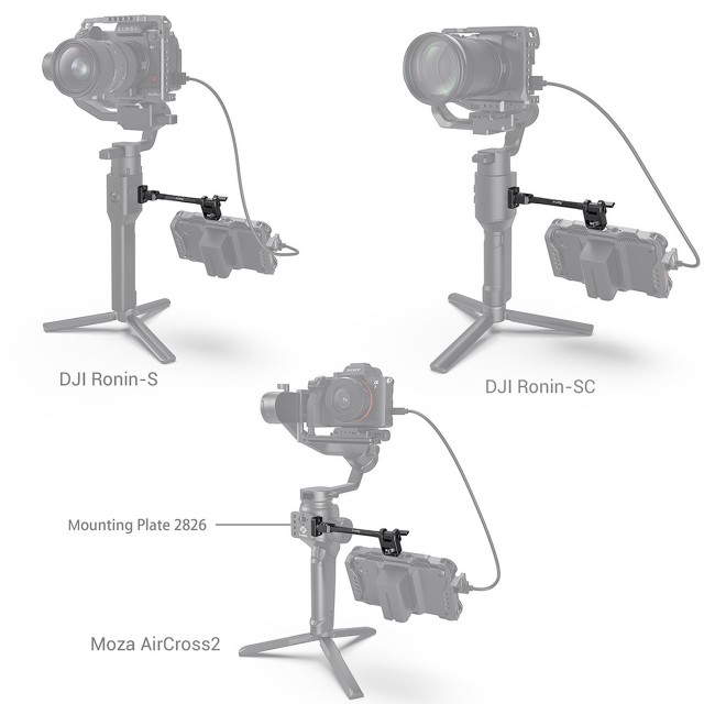 SmallRig podesivi nosač monitora za odabrane DJI & Zhiyun & Moza 2889 ručne kardanske stabilizatore dizajniran je za montažu monitora i dodataka na stabilizatore. Nosač za monitor se pričvršćuje na ZHIYUN CRANE 3/3S, WEEBILL-S/LAB pomoću 1/4"-20 vijka i ugrađene rozete kako bi se spriječilo uvijanje, a pričvršćuje se na stranu DJI Ronin-S/SC/RS 2 /RSC 2 pomoću rozete adapterske ploče. Ima tri navoja 1/4"-20 za dodatne dodatke kao što je Cold Shoe 2260 za mikrofon ili audio prijemnik. Nosač monitora ima raspon nagiba od 360° i drži sklop monitora težine do 2,2 kg.