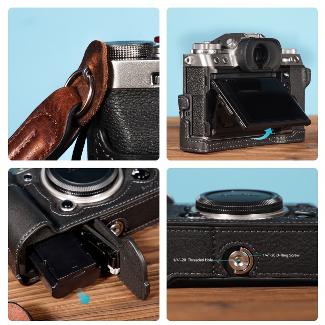 SmallRig Half Case / Wrist Kit Kit za FUJIFILM X-T5 3927 dizajniran je za zaštitu fotoaparata i poboljšanje iskustva držanja. Izrađena od izdržljive i prozračne goveđe kože, povijesna polovica futrole pričvršćuje se na kameru s 1/4"-20 vijkom na dnu. Održava potpuni pristup preklopnom zaslonu, gumbima, pretincu za baterije, utoru za kartice itd. Ugrađeni okvir od aluminijske legure za zrakoplove ne samo da savršeno pristaje fotoaparatu, već ga štiti od ogrebotina i udaraca, dok baza od aluminijske legure poboljšava prianjanje. Osim toga, donji navoj od 1/4"-20 omogućuje kućištu biti izravno pričvršćen na tronožac. A narukvica je izrađena od goveđe kože i najlona za dodatnu udobnost i pouzdanost. Slobodni okidač pomaže poboljšati kontrolu dodirom.