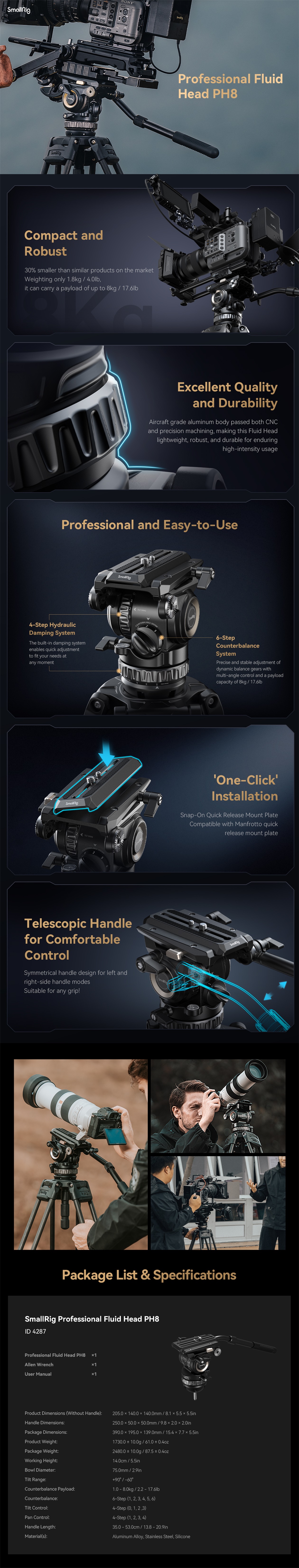 SmallRig Professional Fluid Head PH8 4287 profesionalna je fluidna glava za olakšavanje video snimanja. Tekuća glava ima podesivi sustav protuteže u 6 koraka. Kada je visina gravitacijskog središta 55 mm, sustav protuteže u 6 koraka uravnotežuje kameru ili druge opreme (do 8 kg) i točno kontrolira nagib kamere.