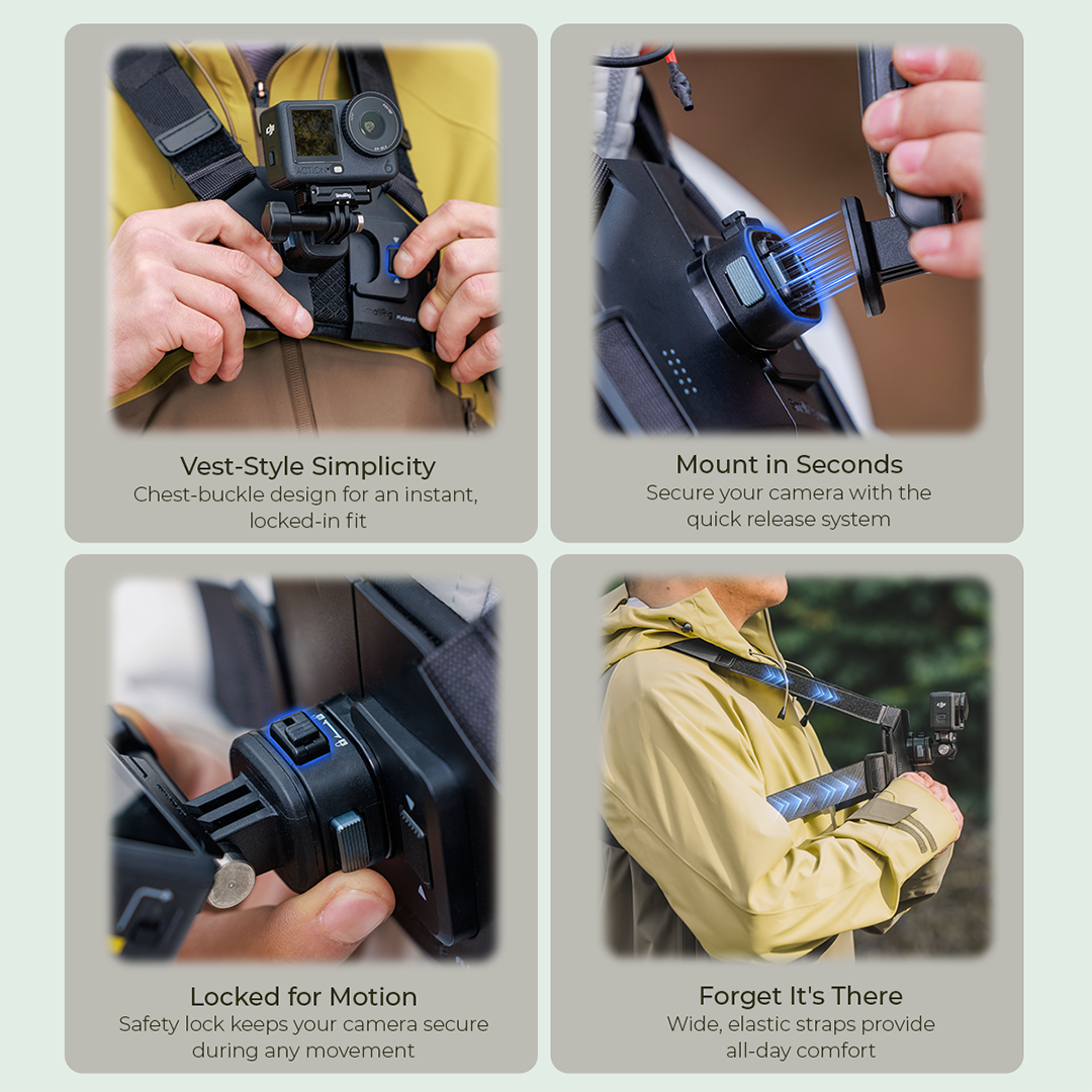 SmallRig brzi prslukni nosač za akcijske kamere (5720) omogućuje stabilno snimanje bez upotrebe ruku tijekom dinamičnih aktivnosti na otvorenom poput ribolova, vožnje čamcem, skijanja i drugih pustolovina punih akcije. Njegov dizajn u stilu prsluka omogućuje oblačenje i skidanje za jednu sekundu pomoću praktičnog prednjeg sustava kopči, pružajući brzu montažu uz sigurno i udobno pristajanje.