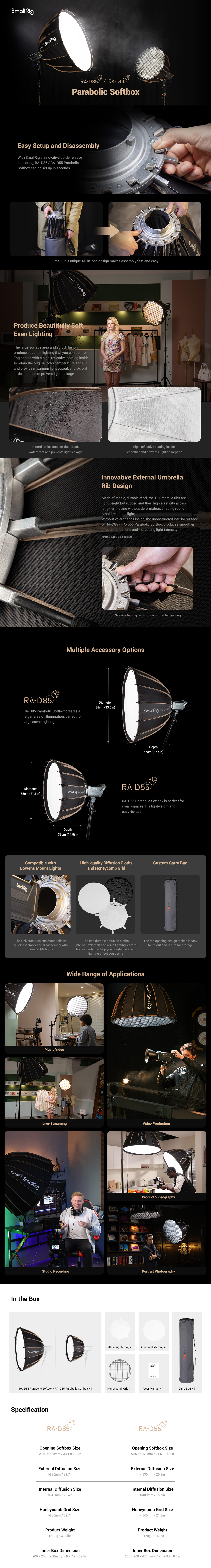 SmallRig RA-D85 3586 parabolični softbox je univerzalni dodatak promjera 85 cm. Zahvaljujući univerzalnom dizajnu nosača Bowens, kompatibilan je sa SmallRig RC 120D/RC 120B/RC 220D/RC220B i drugim svjetlima za montiranje Bowens. Zahvaljujući novom dizajnu za brzo otpuštanje, kupolu možete jednostavno postaviti i ukloniti u 15 sekundi.