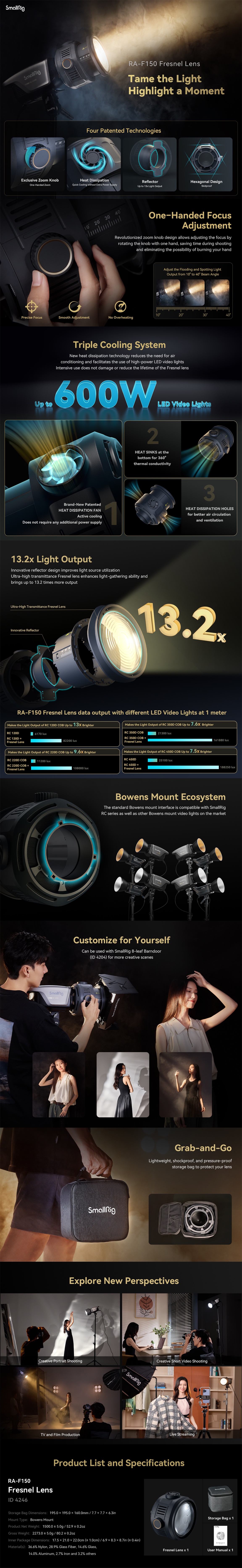 SmallRig RA-F150 Fresnelova leća 4246 je dodatak za profesionalno fokusiranje. Omogućuje točnije prelivanje i uočavanje svjetla na bilo koji objekt ili scenu. Inovativni dizajn Fresnelove leće visoke propusnosti promjera 150 mm i ugrađenog reflektora donosi 10 puta više izlaza. Inovativni zoom-in/out dizajn omogućuje podešavanje fokusa samo jednom rukom, čime se štedi vrijeme tijekom snimanja i eliminira mogućnost pregrijavanja ruke. Zakrenite gumb za fokusiranje kako biste preplavili kut snopa od 10° do 40°. Standardno sučelje za montiranje Bowens kompatibilno je s SmallRig RC120 / 220 / 350 / 450 kao i s drugim svjetlima za montiranje Bowens na tržištu. Također, ova Fresnel leća može raditi s SmallRig 8-lisnim barndorima za stvaranje više svjetlosnih efekata.