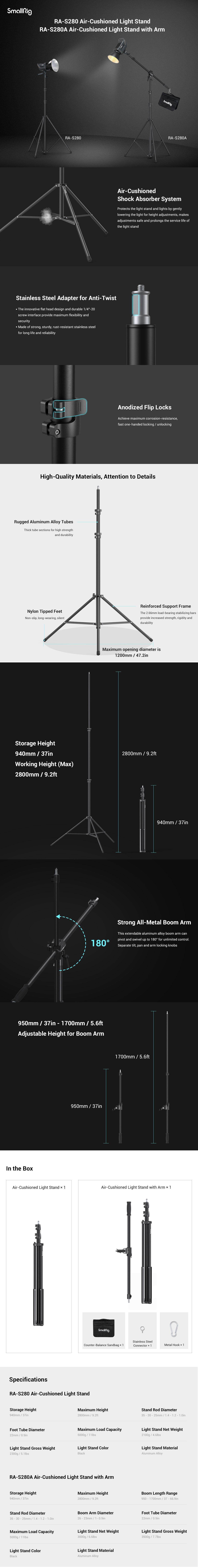 Dizajn sa zračnim jastukom za zaštitu svjetla i prstiju od slučajnog spuštanja. Slobodno podesiva visina od 94 cm do 280 cm, pogodna za različite scenarije; sklopljena duljina 94 cm, laka za nošenje. Uglavnom od aluminijske legure i željeza; željezna potporna šipka debela je 2,66 mm i široka 15 mm, a gumb od aluminijske legure je jak i izdržljiv; dolazi s visokom nosivošću, kao i brzim i učinkovitim preklopnim zaključavanjem.