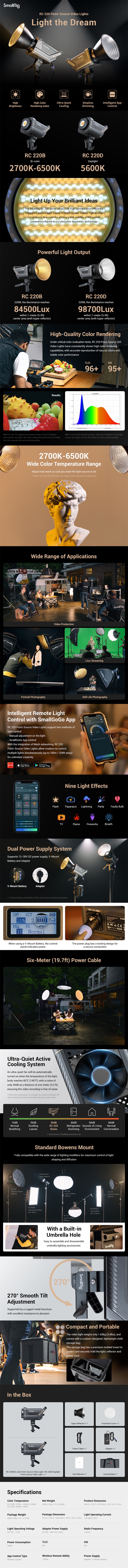 SmallRig RC220B (3621) još je jedan predstavnik prve generacije profesionalnih studijskih LED svjetala marke SmallRig. Koristi modernu LED tehnologiju COB (Chip-On-Board) za visoki intenzitet (8670 lx @ 5600K), kao i visoko učinkovit reflektor za postizanje intenziteta do 84500 lx u središtu svjetlosnog toka na udaljenosti od 1 m. Također nudi visoku točnost boja (CRI 95+, TLCI 96+), Bowens bajunet za jednostavnu montažu standardnih dodataka (softboxes, itd.) i devet integriranih efekata (Paparazzi, Firework, Lightning, Fault Bulb, TV, Breath , Flash, Party, Flame) upravljajte ručno i bežično pomoću aplikacije SmallGoGo. Varijanta RC220B ima temperaturu boje podesivu u rasponu od 2700-6500K (+/- 200K) i maksimalni intenzitet od 8670 lx ili 84 500 lx s ugrađenim reflektorom.