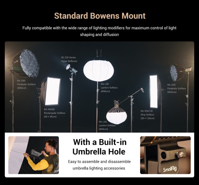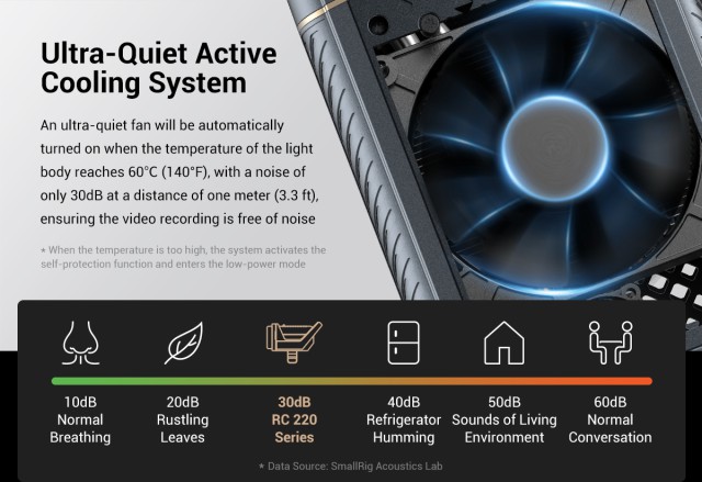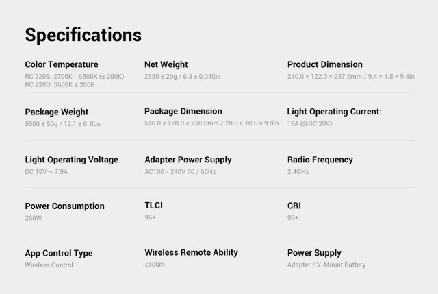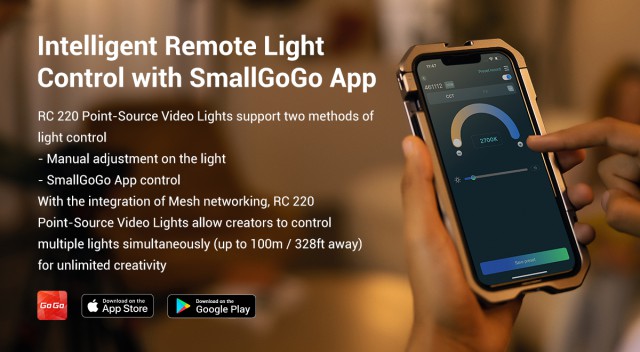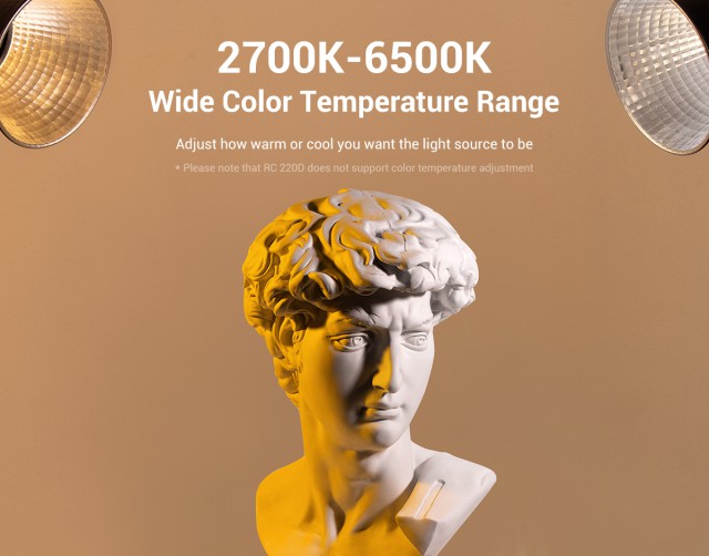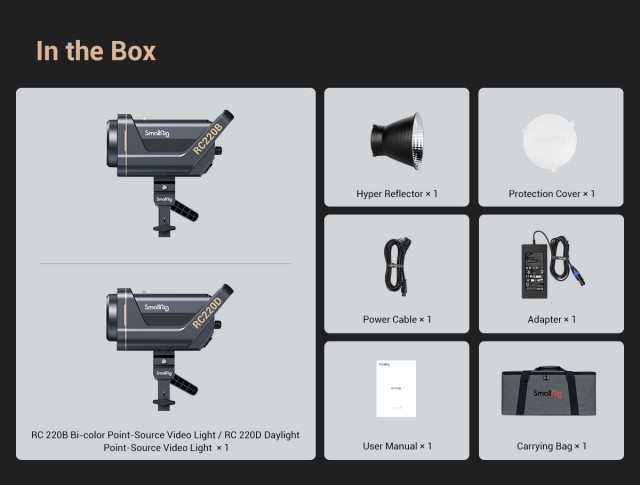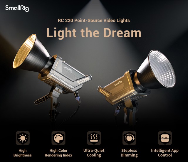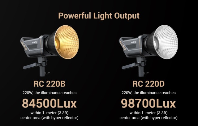 SmallRig RC220D (3618) je još jedan, snažniji predstavnik prve generacije profesionalnih studijskih LED svjetala marke SmallRig. Koristi modernu LED tehnologiju COB (Chip-On-Board) za visoki intenzitet (10.100 lx) kao i visoko učinkovit reflektor za postizanje intenziteta do 98.700 lx u središtu svjetlosnog toka na udaljenosti od 1 m. Također nudi visoku točnost boja (CRI 95+, TLCI 96+), Bowens bajunet za jednostavnu montažu standardnih dodataka (softboxes, itd.) i devet integriranih efekata (Paparazzi, Firework, Lightning, Fault Bulb, TV, Breath, Flash , Party, Flame) koji se mogu kontrolirati zajedno s postupnim postavkama intenziteta ručno ili bežično pomoću aplikacije SmallGoGo. Varijanta RC220D ima postavljenu temperaturu boje od 5600K (+/- 200K) i maksimalni intenzitet od 10.100 lx ili 98.700 lx s ugrađenim reflektorom.