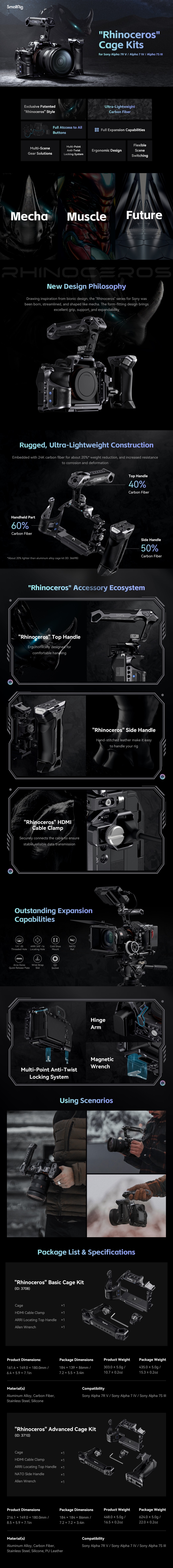 Napredni kavezni komplet SmallRig "Rhinoceros" za Sony Alpha 7R V / Alpha 7 IV / Alpha 7S III 3710 dizajniran je za smanjenje naprezanja ramena, povećanje stabilnosti i pružanje točaka za pričvršćivanje dodataka. Komplet uključuje kavez, gornju ručku, bočnu ručku i stezaljku za HDMI kabel. Kavez i obje ručke su prijenosni jer su izrađeni od lakših ugljičnih vlakana i stoga omogućuju duže snimanje iz ruke. U slučaju kaveza, kamera je čvrsto pričvršćena zajedno klinom za pozicioniranje, vijkom 1/4"-20 i vijkom M2,5. Ima čist, pojednostavljen dizajn koji omogućuje potpuni pristup gornjim gumbima. gornja ručka je praktična za nošenje i snimanje pod niskim kutom; bočna ručka, izrađena od laganih karbonskih vlakana i PU kože, omogućuje udobno i čvrsto držanje. a stezaljka HDMI kabela, stegnuta vijkom s ravnom glavom, štiti sučelje i osigurava stabilan prijenos signala. Set je također opremljen rupama s navojem od 1/4" - 20 za Magic Arm 3873 , hladnim papučicama za mikrofon, LED video svjetlom i ARRI 3/8"-16 rupama za pozicioniranje za bočnu ručku 2914. NATO vodilice i ploča za brzo otpuštanje Arca-Swiss povećavaju svestranost kaveza. Konkretno, ploča Arca-Swiss omogućuje brzo prebacivanje između ručnih, stativnih i gimbalnih načina rada (DJI RS 2 / RSC 2 / RS 3 / RS 3 Pro).