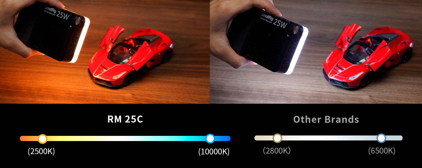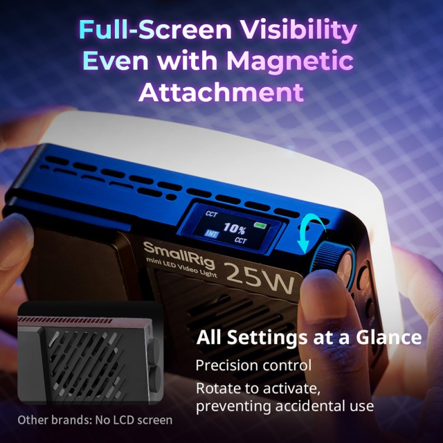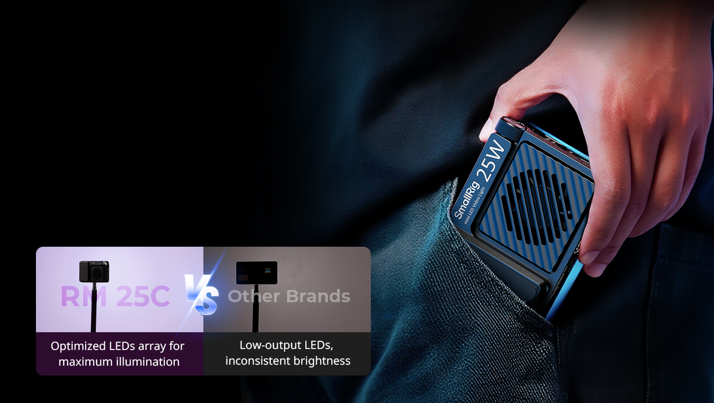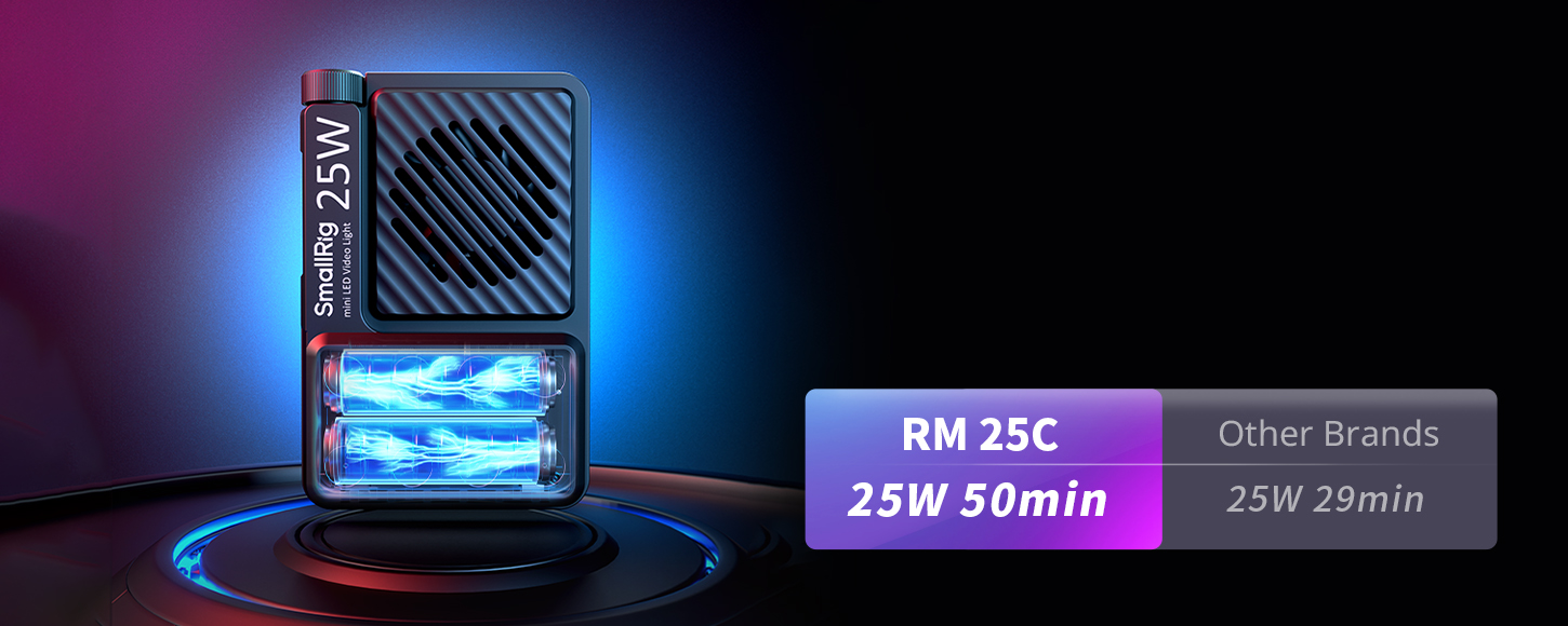 SmallRig RM 25C mini LED video svjetlo s integriranom baterijom. Svestrano RGB+CCT osvjetljenje: Ima CRI 96, TLCI 99, podesive dvobojne temperature od 2500K do 10000K, više od 36000 boja i 14 ugrađenih svjetlosnih efekata. Idealno za snimanje mrtve prirode, hrane i kreativno portretno osvjetljenje.