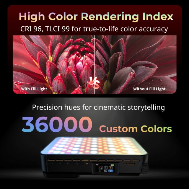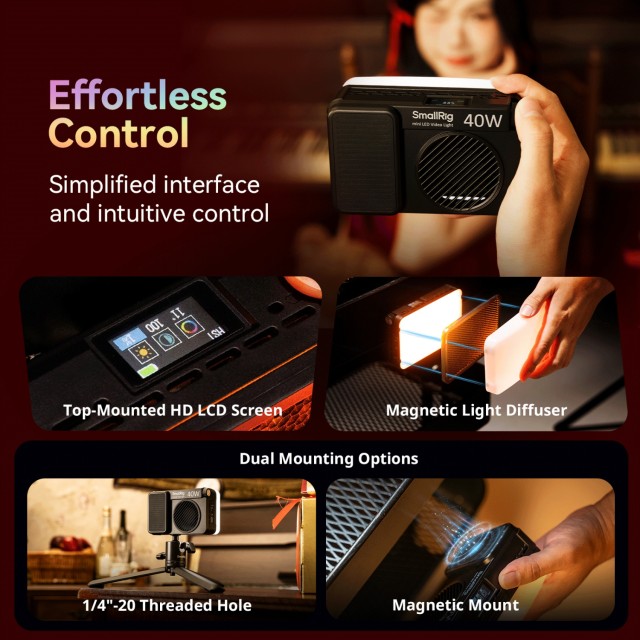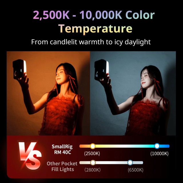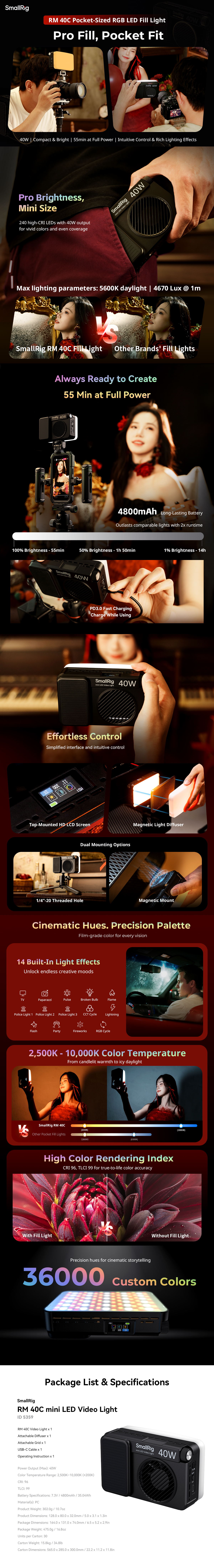 SmallRig RM 40C je mini LED svjetlo velike snage 40 W s RGBWW tehnologijom. Kompaktno, ali snažno, ima produljeno vrijeme rada od 55 minuta i RGB osvjetljenje u punoj boji za širu kontrolu temperature boja i raspona boja. S jednostavnim rukovanjem, magnetskim pričvršćivanjem i brzim PD punjenjem, savršeno je za kreativce u pokretu.