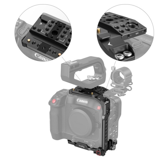 Ručni komplet SmallRig za Canon EOS C70 3899 dizajniran je za zaštitu fotoaparata i pružanje točaka za pričvršćivanje dodataka, omogućujući udobno snimanje iz ruke. Uključuje: gornju ploču, bočnu ploču, osnovnu ploču, odvojivu produženu osnovnu ploču, gornju NATO ručku, stezaljku za kabel itd., od kojih praktična gornja NATO ručka olakšava pomicanje fotoaparata i stabilizira snimanje; gornja ploča, osnovna ploča i bočna ploča mogu se sastaviti u polukavez koji podržava izvornu jedinicu ručke i jedinicu držača mikrofona. Baza polukaveza sastoji se od osnovne ploče i uklonjive produžene osnovne ploče.