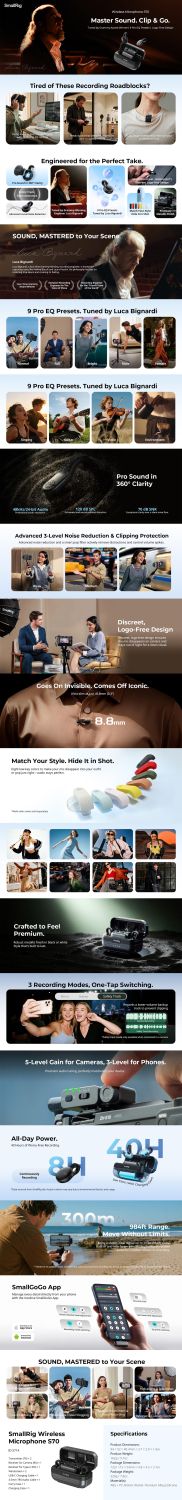 SmallRig S70-A bežični mikrofon (sve u jednom) (crni) 5714 dizajniran je za kreatore sadržaja i streamere koji rade na više uređaja. Idealan je za širok raspon scenarija, uključujući streaming uživo, dnevni vlog, produkciju kratkih videa, snimanje na putovanjima i intervjue.