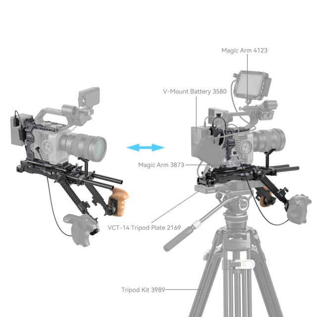 Među tim dijelovima, ergonomski silikonski jastučić za rame pruža ugodno iskustvo snimanja. Sadrži dvoslojnu ploču za brzo otpuštanje na vrhu, okomito podesivu stezaljku šipke od 15 mm sprijeda za ponovno balansiranje kamere i pričvršćivanje šipki od 15 mm, kao i VCT-14 osnovnu ploču za brzo otpuštanje na dnu, koja radi s VCT-14 Quick Release Stativ Plate 2169 za prebacivanje između načina ramena i načina rada stativa.