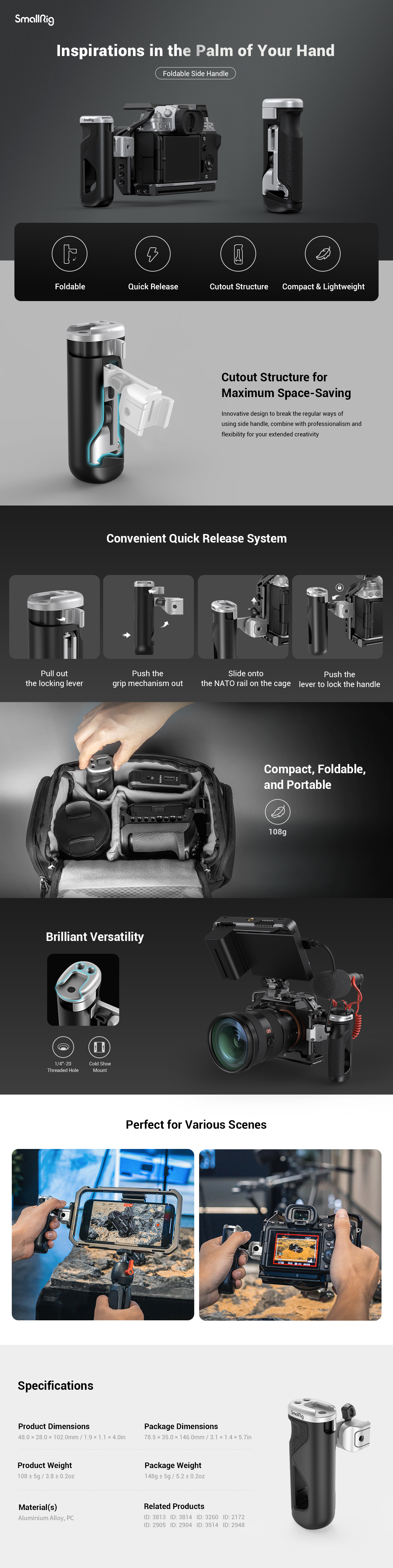 Preklopna bočna ručka SmallRig 3922 dizajnirana je za udobno držanje i praktičnu pohranu. Za razliku od tradicionalnih, ova sklopiva i kompaktna ručka može se smjestiti u uski prostor ili u džep. Njegov inovativni sklopivi i brzo otpuštajući dizajn omogućuje jednostavno rastavljanje i sastavljanje, čineći snimanje i pohranjivanje puno lakšim. Ručka je teška oko 108 g i odlikuje se malom težinom, kompaktnošću i prenosivošću. Uz praktičan dizajn zaključavanja, siguran je i siguran. Dostupan je za lijevu i desnu ruku i ima držač za hladnu obuću i 1/4"-20 rupe s navojem na vrhu za pričvršćivanje raznih dodataka.