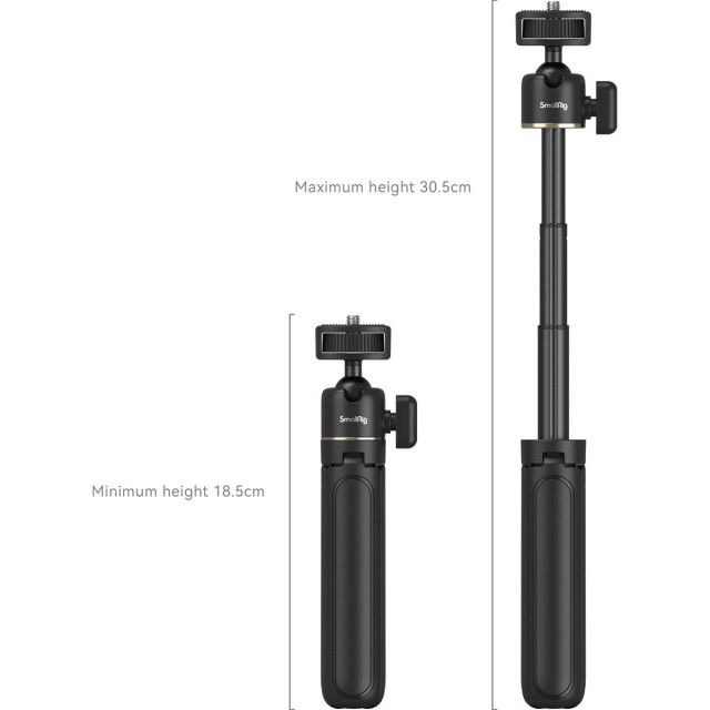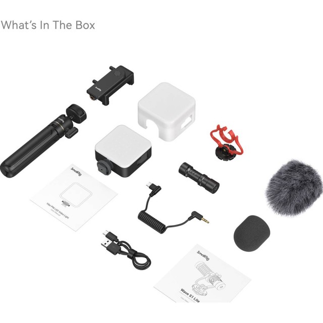 SmallRig Smartphone Vlog Stativ Kit VK-50 Advanced Version 4369 sastoji se od stolnog teleskopskog stativa, Easy Loading držača za pametni telefon, Wave S1 Lite mikrofona na kameri, Vibe P96 LED video svjetla i softboxa. Ovaj kompaktni i prijenosni komplet ima impresivnu nosivost od 1,5 kg / 3,3 lb. Jedan 1/4"-20 vijak pričvršćuje tronožac za držač pametnog telefona, koji ima jedinstven dizajn koji se lako uvlači za brzo pričvršćivanje i uklanjanje pametnog telefona.