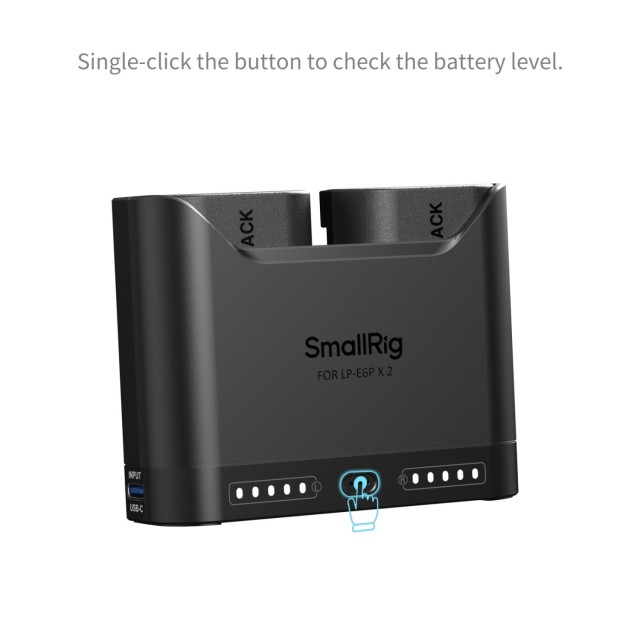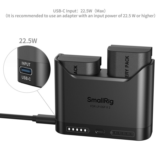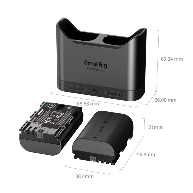SmallRig Turbo komplet za punjenje baterija fotoaparata LP-E6P 5485 uključuje dvije visokoučinkovite baterije i dvokanalni brzi punjač. S čipom za potpuno dekodiranje, ovaj komplet osigurava potpunu kompatibilnost s Canon LP-E6P baterijama, podržavajući fotoaparate poput EOS R5 II. Eliminira skočna upozorenja, a istovremeno održava prikaz napajanja u fotoaparatu i kompatibilnost s originalnim Canon punjačima.