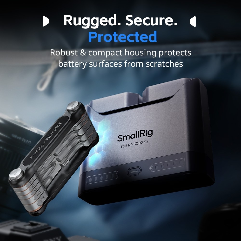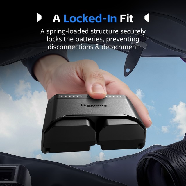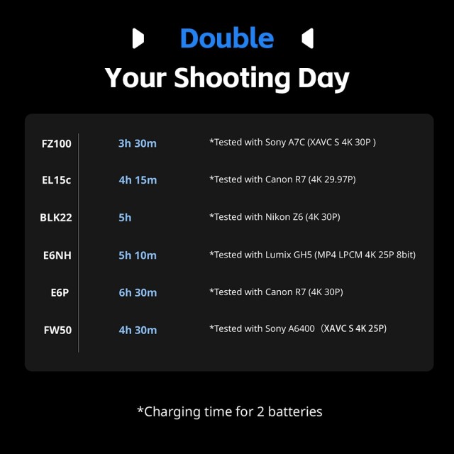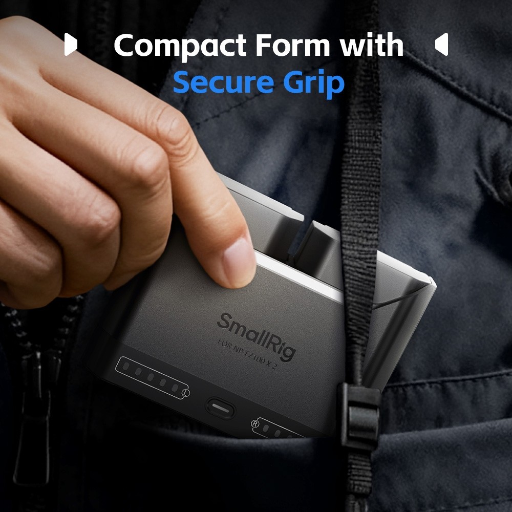 Svaka baterija pruža nazivni izlaz od 1030 mAh, što omogućuje dulje vrijeme snimanja za zahtjevne radne procese. Dizajn punjača s dva utora omogućuje istovremeno punjenje dviju baterija ili punjenje jedne baterije, potpuno puneći dvije baterije za otprilike 1,5 sat za optimalnu učinkovitost.