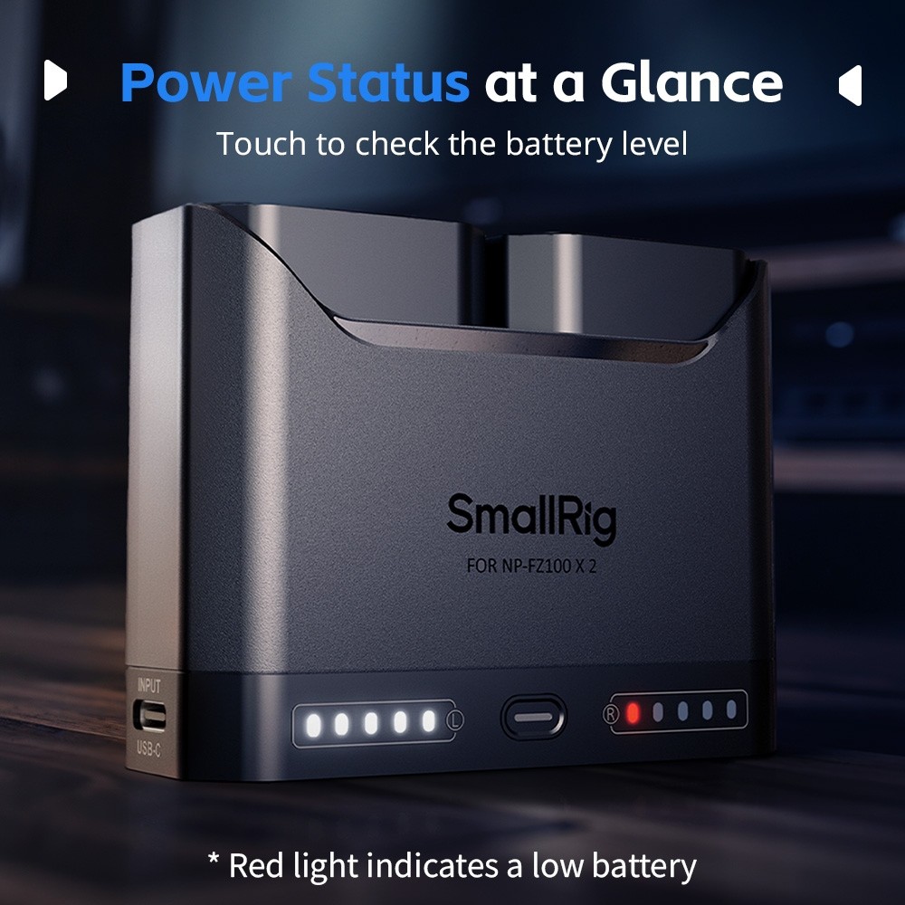 Svaki kanal za punjenje ima pet LED indikatora koji prikazuju razinu napunjenosti u koracima od 20%, čak i bez vanjskog napajanja. Crveno svjetlo upozorenja aktivira se kada je razina baterije kritično niska. Osim toga, punjač uključuje univerzalni USB-C ulazni priključak i dolazi s kabelom za brzo punjenje, što ga čini kompatibilnim sa zidnim adapterima, auto punjačima i power bankovima za svestrane mogućnosti punjenja.