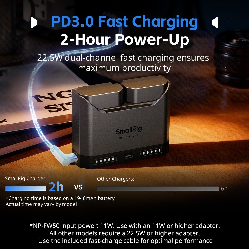 SmallRig Turbo komplet za punjenje baterija za fotoaparat NP-FW50 5488 uključuje dvije baterije i dvokanalni brzi punjač. S čipom za potpuno dekodiranje, ovaj komplet osigurava potpunu kompatibilnost sa Sony NP-FW50 baterijama, uklanjajući skočna upozorenja, a istovremeno podržava prikaz napajanja u fotoaparatu i korištenje originalnog punjača.