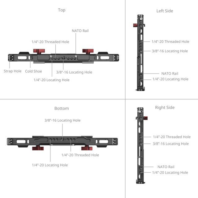 6. Ugrađene rupe za lociranje 1/4"-20 i 3/8"-16, utor za remen, držač za hladnu cipelu i NATO šinu, što vam omogućuje montiranje kao što su NPF adapteri, držači za napajanje, nosači za SSD, ručke ,.itd.