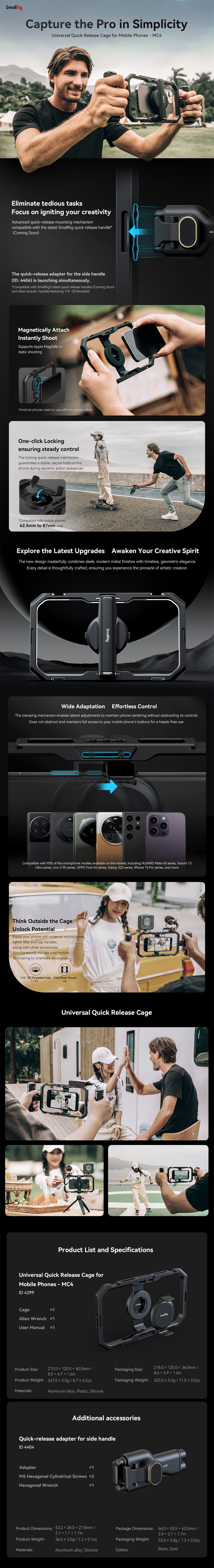 SmallRig Universal Quick Release Mobile Phone Cage MC4 4299 je profesionalno i praktično rješenje za mobilno video snimanje i emitiranje uživo. Kavez je opremljen nosačima za hladne cipele i rupama s navojem od 1/4"-20 na okviru, što korisnicima omogućuje jednostavno pričvršćivanje svjetala, mikrofona, stativa, bočnih rukohvata, gornjih rukohvata i druge opreme prilikom snimanja mobilnim telefonima. Bilo da pričvrstite bočnim držačem, gornjom ručkom ili stativom, ovaj kavez ne samo da je kompatibilan sa standardnim proizvodima pričvršćenim vijkom od 1/4"-20, već podržava i novi SmallRig ekosustav brzog otpuštanja koji pruža praktičnost, brzinu, stabilnost i učinkovitost. Kada koristite mobilni telefon s MagSafeom za stabilno statičko snimanje, telefon možete pričvrstiti izravno na MagSafe bazu na kavezu. Ako koristite telefon bez MagSafea ili snimate dinamične scene, trebali biste učvrstiti telefon priloženom kopčom prije snimanja.