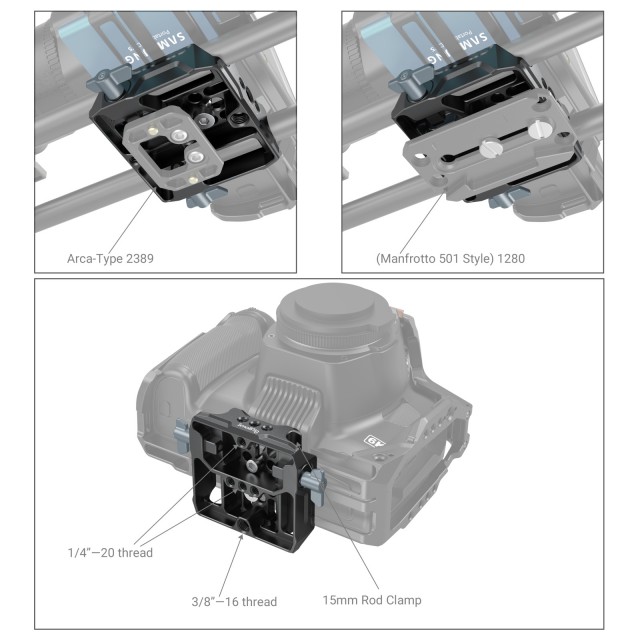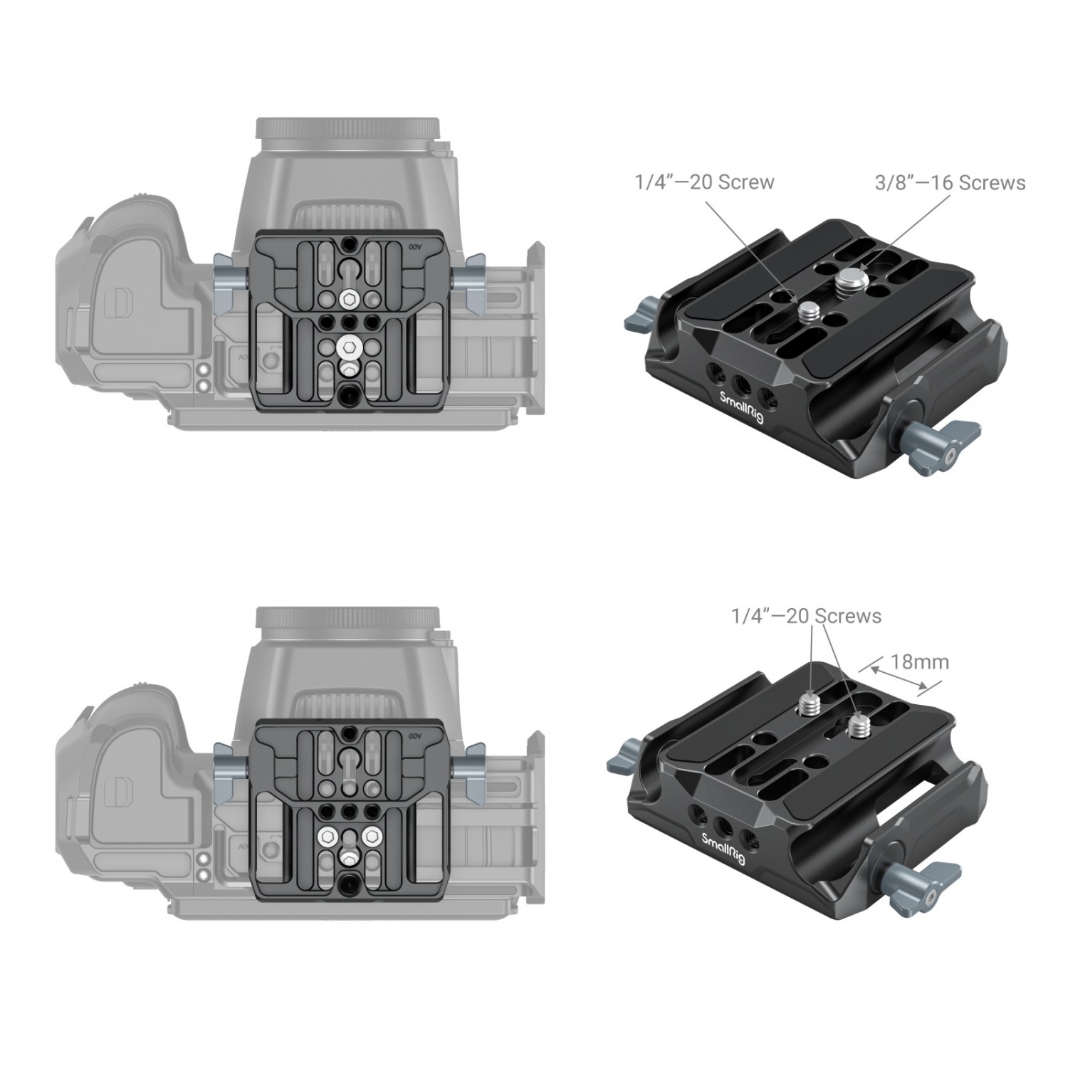 Lagana i kompaktna univerzalna osnovna ploča SmallRig LWS s dvostrukom stezaljkom za šipke od 15 mm 3357 prikladna je za uobičajene okvire za DSLR fotoaparate i fotoaparate bez ogledala na tržištu. Radi s dvostrukom šipkom od 15 mm za pričvršćivanje, na primjer, dodatnog nosača leće, praćenja fokusa i mat kutije pri snimanju i snimanju iz ruke i sa stativa. Kada se koristi s kavezom BMPCC 6K Pro 3270, može pružiti optičku visinu od 85 mm. Njegov posebno dizajnirani donji dio omogućuje zamjenu Samsung T5 SSD-a bez skidanja matične ploče. Veliki ugrađeni gumeni jastučići sprječavaju grebanje i uvijanje. Nekoliko rupa s navojem na dnu omogućuje pričvršćivanje ploča za brzo otpuštanje različitih veličina za snimanje sa stativa.
