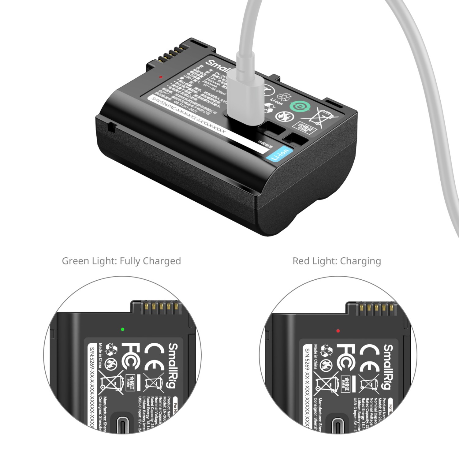 Ugrađeni USB-C priključak za punjenje omogućuje izravno punjenje s prijenosnih baterija, zidnih adaptera, auto punjača ili produžnih utičnica, eliminirajući potrebu za posebnim punjačem. Podržava ulaz od 5 V/2 A, a baterija se potpuno napuni za otprilike 2,5 sata. Smještena u laganom, vatrootpornom plastičnom kućištu izdržljivog dizajna, baterija SmallRig EN-EL15c uključuje USB-A na USB-C kabel za punjenje i zaštitni poklopac kontakata, što je čini idealnom za putovanja, studijsku i terensku upotrebu.