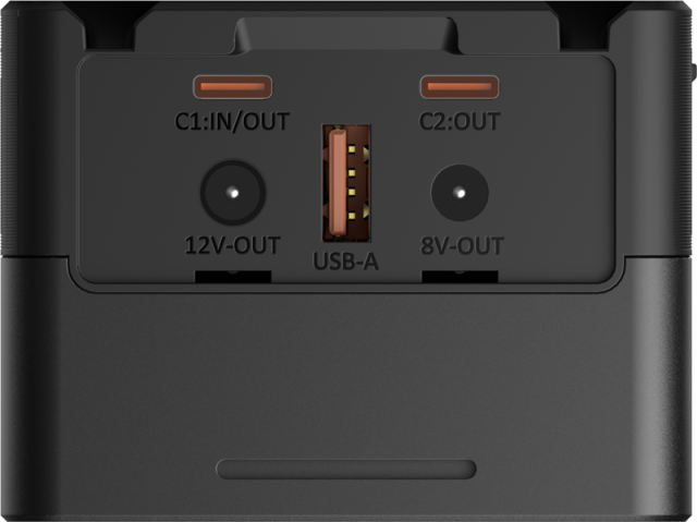 Nabízí všestranná rozhraní, včetně D-tap, USB-C, USB-A, DC 8V a DC 12V, pro efektivní nabíjení a napájení fotoaparátů, videokamer, monitorů, bezdrátových video vysílačů, LED světel, mobilních telefonů, notebooků a dalších zařízení, čímž eliminuje potřebu adaptéru V-mount.
