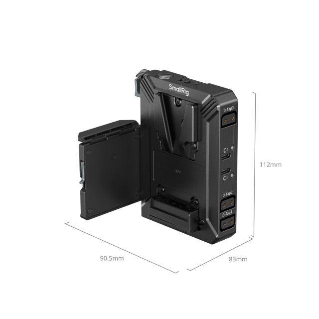 Strateški postavljeni izlazi za napajanje, uključujući D-Tap i USB-C, omogućuju istovremeno napajanje više uređaja bez ometanja rada kamere ili gornje ručke. USB-C priključak podržava PD ulaz do 65 W, a služi i kao V-mount punjač baterija. Sigurnosna poluga okidača na gumbu za otpuštanje baterije sprječava slučajno isključivanje radi sigurnog rada.