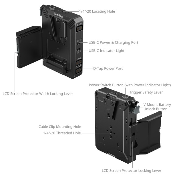 SmallRig V-Mount ploča za montažu baterije nudi pojednostavljeno rješenje za integraciju V-mount baterija u vašu kameru. Dizajniran za brzo postavljanje baterije i distribuciju napajanja više uređaja, ovaj sustav uključuje V-mount ploču za bateriju i modularnu zaštitu za LCD zaslon. Ploča se sigurno pričvršćuje na kompatibilne kamere, omogućujući brzu zamjenu baterija i neprekinuto napajanje.