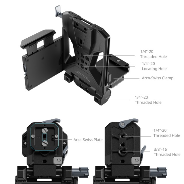 Ploča baterije ima Arca-Swiss mehanizam za brzo otpuštanje, što omogućuje montažu i podešavanje bez alata za brzo postavljanje V-mount baterije. Arca-Swiss stezaljka, opremljena polugom za podešavanje, kompatibilna je s većinom Arca-Swiss ploča na tržištu, uključujući kaveze i L-oblikovana nosača, što omogućuje besprijekornu integraciju. Njezin uvlačivi dizajn odgovara fotoaparatima bez zrcala različitih veličina.