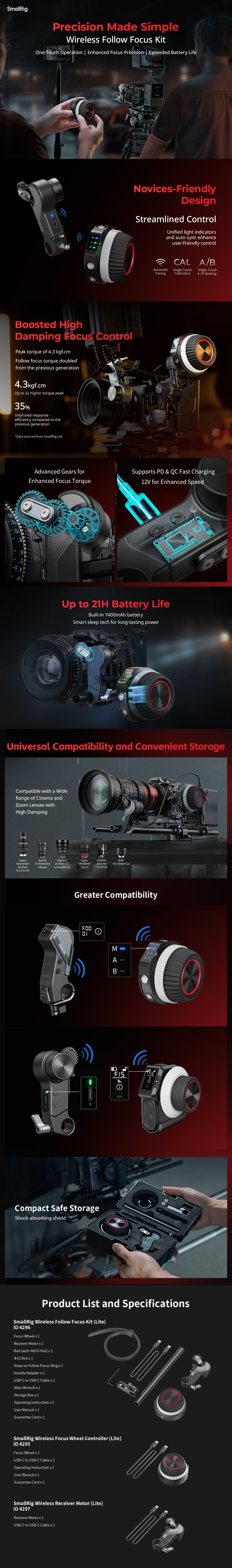 Bezdrátový ovladač SmallRig Handwheel Controller (Lite) 4295 je vybaven funkcí ukládání do paměti, která eliminuje nutnost rekalibrovat nastavení dráhy objektivu a bodu AB v případě výpadku napájení, což zvyšuje efektivitu fotografování. Toto zařízení je vybaveno vestavěnou baterií s kapacitou 1400 mAh a poskytuje přibližně 21 hodin delšího používání. Je vybaven světelnými indikátory a přehlednou ikonografií, která pomocí červených a modrých světel označuje stav připojení a kanály (modré světlo - F00-1; zelené světlo - F15-1) a nabízí intuitivní a uživatelsky přívětivé pokyny pro jednoduché a efektivní ovládání. Zaostřovací kolečko je vyrobeno z protiskluzového silikonového materiálu odolného proti potu a zajišťuje pohodlné a stabilní tlumené zaostřování v různých teplotních podmínkách.