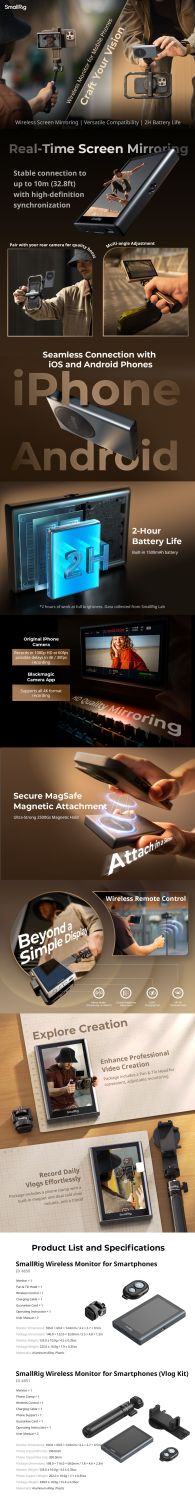 SmallRig bežični video monitor za telefon 4850B nudi rješenje za zrcaljenje zaslona za stvaranje mobilnog sadržaja. Proizvod sadrži monitor za mobilni telefon, glavu za pomicanje i naginjanje, bežični daljinski upravljač, kabel za punjenje i drugu dodatnu opremu. Monitor se može montirati na nosač telefona pomoću glave za pomicanje i naginjanje ili magnetski pričvrstiti na iPhone uređaje ili telefone s magnetskim prstenovima, što nudi svestranost. Tijekom mobilnog fotografiranja iz niskog kuta ili snimanja stražnjom kamerom, monitor može prikazati zrcalnu sliku s mobilne kamere u stvarnom vremenu.