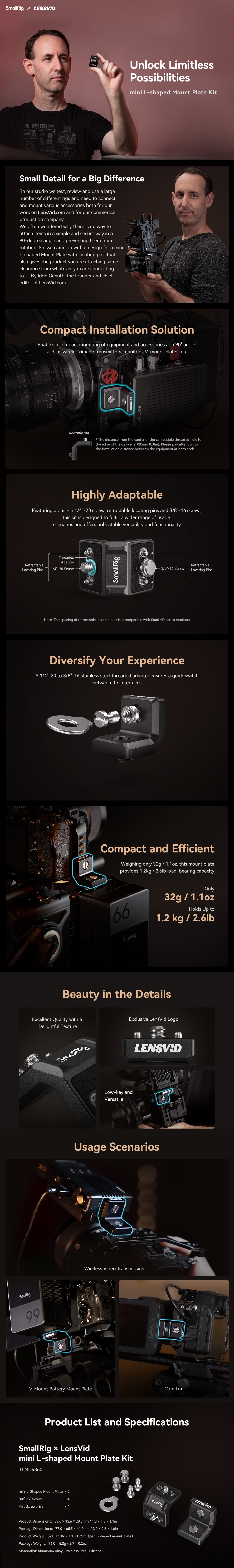 SmallRig x LensVid mini L-Shaped Mount Plate Kit MD4360 zajednički je dizajnirao Iddo Genuth, suosnivač i urednik LensVid.com, web stranice za fotografije i videozapise koja posluje već 10 godina, i programa SmallRig DreamRig. Ovaj komplet pruža kompaktnije rješenje za montažu opreme i dodataka, kao što su bežični odašiljači slike, monitori, V-montažne ploče itd., pod kutom od 90° u odnosu na vašu kameru. Također dolazi s četiri rješenja za montažu: vijak 1/4”-20, vijak za lociranje 1/4”-20, vijak 3/8”-16 i rupa za lociranje ARRI 3/8”-16 za ispunjavanje više scenarija upotrebe za naši korisnici. Uređaj ima ugrađenu protukliznu silikonsku podlogu koja štiti vašu kameru od ogrebotina i osigurava sigurno postavljanje. Nosivost od 1,2 kg/2,6 lb kompatibilna je s većinom bežičnih odašiljača slike i pribora.