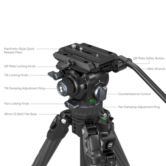 Konstrukcija od karbonskih vlakana čini tronožac laganim i jednostavnim za nošenje bez kompromisa u pogledu čvrstoće, te podržava maksimalnu nosivost koja zadovoljava potrebe većine profesionalnih video snimaka. Noge tronošca opremljene su brzim bravama za brzo i sigurno podešavanje, a podesivi središnji raspršivač daje tronošcu veću stabilnost na neravnom terenu. Set također uključuje podstavljenu torbu za praktično nošenje i pohranu.