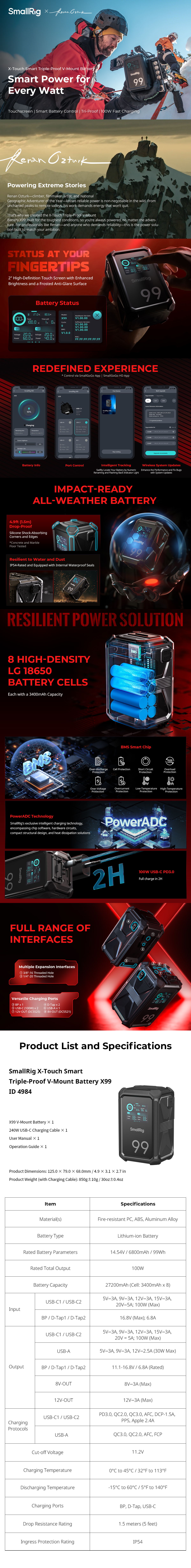 SmallRig X-Touch Smart Triple-Proof V-Mount baterija X99 4984 postavlja novi standard za profesionalna rješenja za napajanje integracijom pametne tehnologije, robusne zaštite, brzog punjenja velike snage i svestranosti s više priključaka, što je čini idealnom za zahtjevna okruženja snimanja. Pametni sustav upravljanja baterijom usredotočen je na 2,0-inčni HD zaslon u boji osjetljiv na dodir s matiranom površinom protiv odsjaja, čime se osigurava optimalna vidljivost u svim uvjetima osvjetljenja. Namjenska mobilna aplikacija nudi opsežne značajke daljinskog upravljanja, uključujući praćenje razine baterije, upravljanje priključkom, praćenje lokacije baterije i OTA ažuriranja, značajno poboljšavajući učinkovitost tijeka rada na setu.