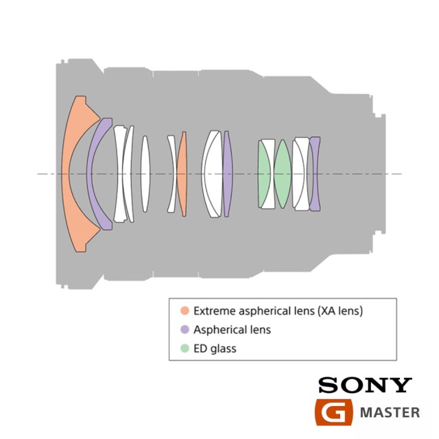 Ovaj objektiv ima dva Sony XA (ekstremno asferična) elementa s površinskom preciznošću od 0,01 mikrona. Izobličenja koja se obično javljaju kod širokokutnih zum objektiva pomno su kontrolirana, kao i astigmatizam i zakrivljenost polja. Neatraktivno zamućenje u obliku prstena luka učinkovito je potisnuto XA (ekstremno asferičnim) elementima tako da se glatko, lijepo zamućenje postiže u područjima izvan fokusa.