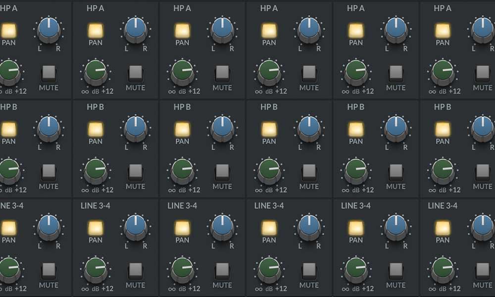 SSL 12 pruža intuitivni mikser u stilu virtualne konzole za biranje mikseva za slušalice. Uz nezavisne kontrole pan, level i mute dostupne za svaki slanje, SSL 12 Mixer daje vam potpunu kontrolu.