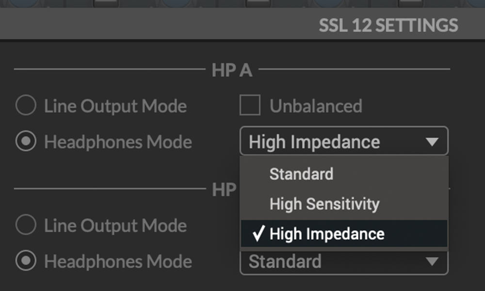 Odaberite između 3 različita načina rada izlaza za slušalice koji najbolje odgovaraju vašim slušalicama – Standard, High Sensitivity ili High Impedance. Ili, možete odabrati prenamjenu svakog HP izlaza kao balansirani/nebalansirani mono izlaz, ako su vam potrebni dodatni izlazi na razini linije iz SSL-a 12.