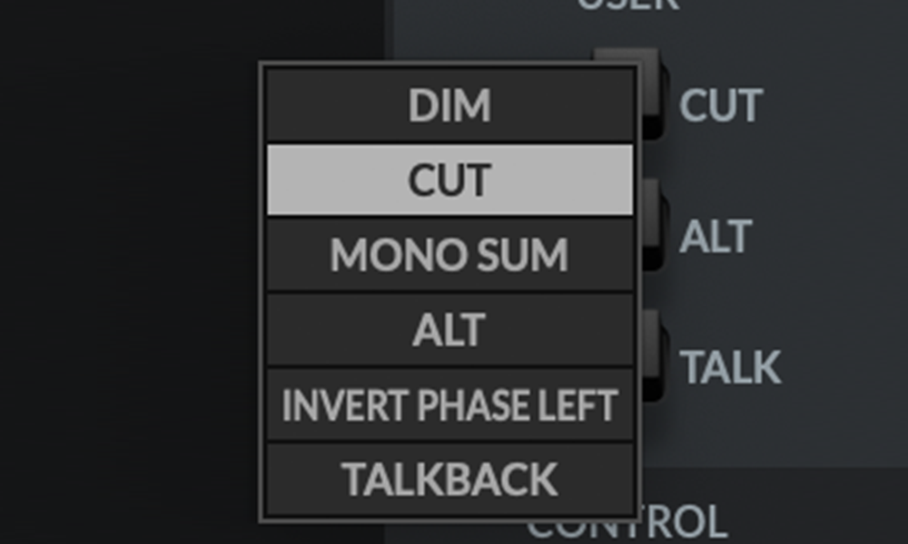 3 prekidača na prednjoj ploči dolaze unaprijed dodijeljena na CUT za monitore, ALT prebacivanje zvučnika i TALKBACK uključivanje/isključivanje mikrofona, ali možete odabrati promijeniti ove gumbe na bilo koju od sljedećih funkcija prema vašim potrebama - DIM, CUT, MONO SUM, ALT, INVERTIRAJ FAZU LIJEVO, TALKBACK.