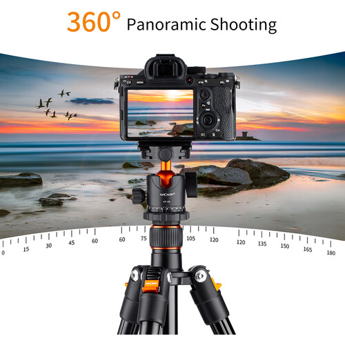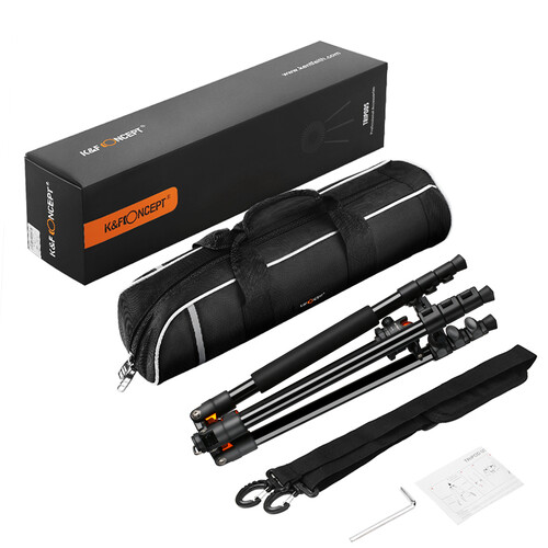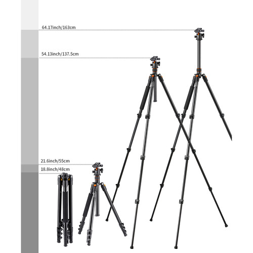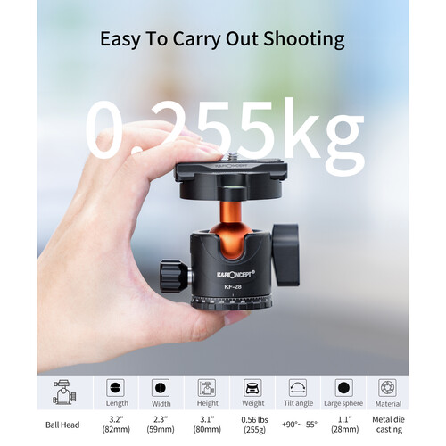 SA234 DSLR aluminijski stativ za kameru s kuglastom glavom iz K&F Concepta izrađen je od laganih, krutih aluminijskih nogu s otključavanjem za brzo postavljanje i kvar. Ovaj praktični tronožac ima maksimalnu visinu od 61,6" i ima nezavisan razmak nogu kako bi se omogućila minimalna visina od 16,3" za nisku perspektivu i makro fotografiju. Noge su također reverzibilne za obrnute položaje kamere sve do razine poda. Ovaj tronožac ima nosivost od 22 lb i uključuje KF-28 kuglastu glavu s kompatibilnom pločom za brzo otpuštanje kompatibilnom s tipom Arca.