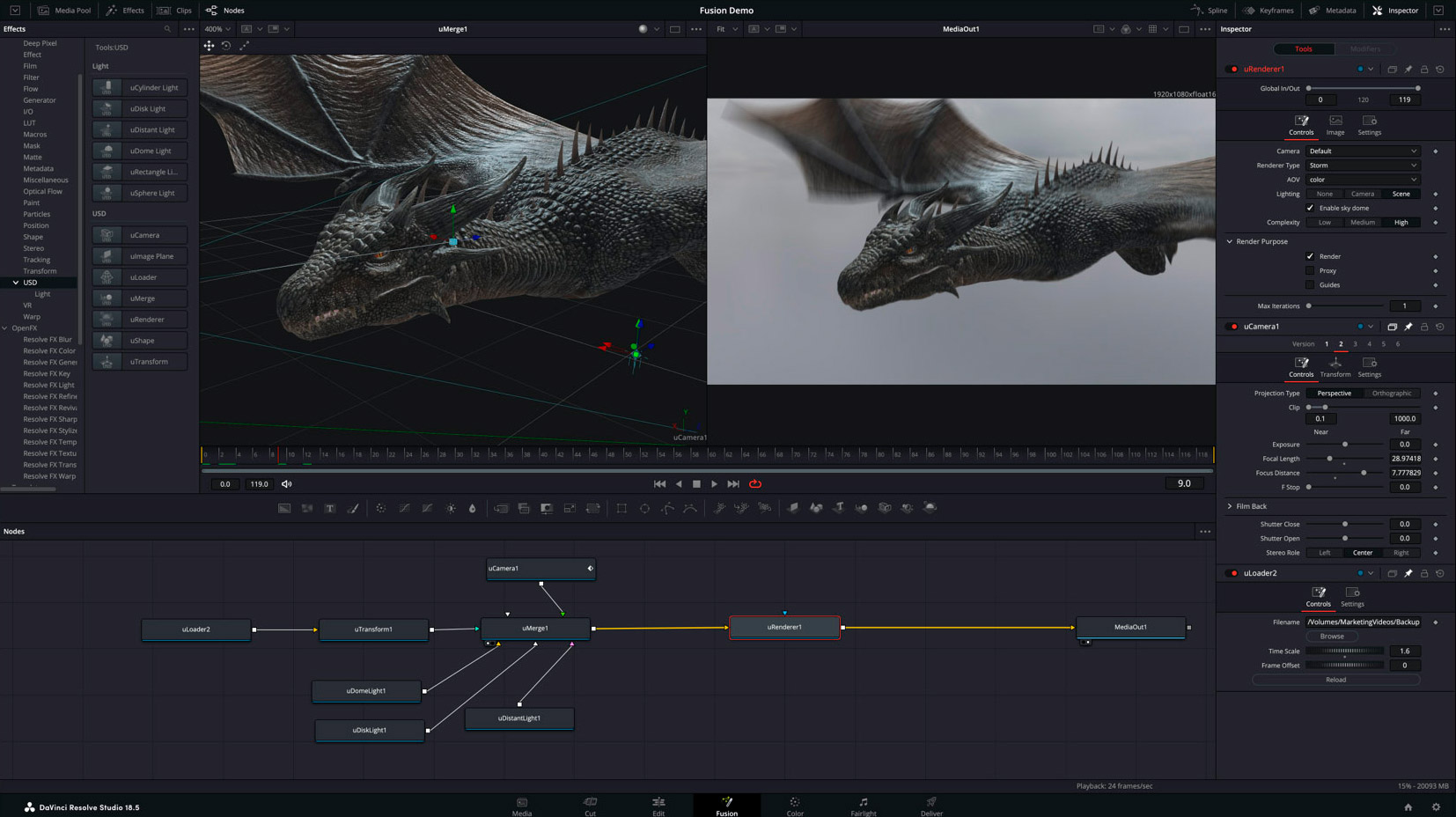 Alat za kompozitiranje Fusion podržava datoteke univerzalnog deskriptora scene od verzije 18.5 za lakšu suradnju s radnim stanicama za efekte. Na ovaj način možete uvesti 3D geometriju, rasvjetu, materijale ili animacije, a zatim modificirati i renderirati scene (koristeći rendere temeljene na Hydra tehnologiji, npr. Storm). Novi alat za višestruko spajanje omogućuje jednostavno kombiniranje različitih medija u slojevite kompozicije; alat Depth Map (u verziji Studio) koji koristi tehnologiju umjetne inteligencije nije ništa manje koristan.