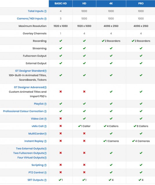 Verzija softvera vMix PRO ima sve parametre vMix 4K , ali dodatno uključuje:
