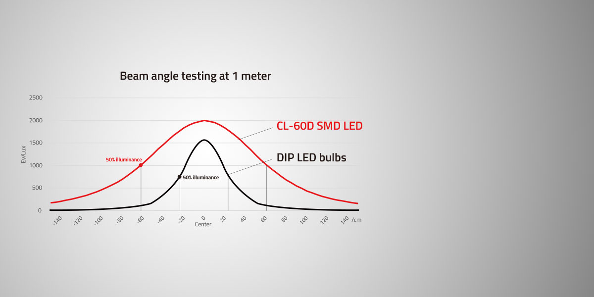 SMD LED diode imaju širi kut snopa u usporedbi s tradicionalnim DIP LED žaruljama. Generirat će ravnomjerno raspršeno svjetlo od središta do ruba, umjesto blještave svjetlosne točke koja se naglo širi od središta do ruba.