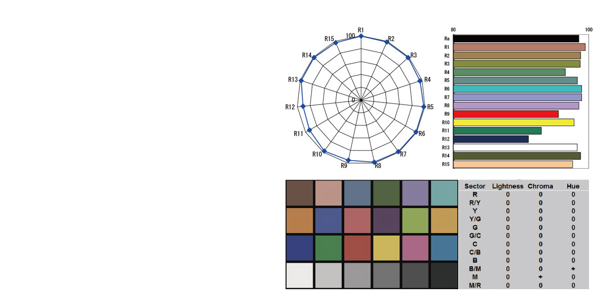 CRI (indeks uzora boja) je mjera sposobnosti izvora svjetlosti da vjerno prikaže boje različitih objekata u usporedbi s prirodnim izvorom svjetlosti. TLCI (indeks konzistentnosti osvjetljenja televizora) je poseban za sposobnost otkrivanja boja senzorom kamere. Maksimalna vrijednost je 100.