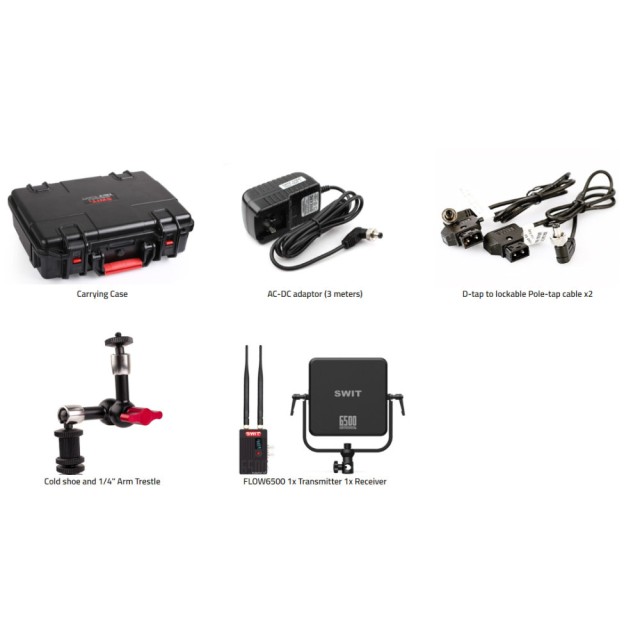 Swit FLOW6500 bežični sustav temelji se na najnovijoj profesionalnoj bežičnoj tehnologiji SWIT KUWI, 5.1-5.9GHz frekvencijski pojasevi bez licence, zadovoljava DFS zahtjeve, podržava 3G/HD-SDI i HDMI priključke (maksimalno 1080p60) za udaljenost prijenosa od 6500 stopa / 2 km linije vida. KUWI profesionalni bežični čip ima stabilnu vezu u svakom složenom okruženju i jaču sposobnost prelaska zidova. Bežična veza na daljinu može se široko koristiti u filmskoj produkciji, prijenosu događaja itd.