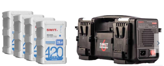 Swit 4x HB-C420S + 1x PC-P461S komplet napravljen je za produkcije koje zahtijevaju dugotrajnu visoku snagu i minimalno vrijeme zastoja. Komplet uključuje četiri Swit HB-C420S super visokoopterećene 28,8V V-Mount baterije, od kojih svaka pruža impresivan kapacitet od 420 Wh i podržava konstantna opterećenja do 500 W, što ih čini idealnim za LED svjetla velike snage i produžene radne postavke.