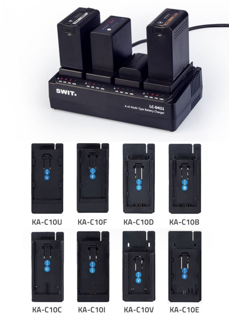 SWIT LC-D421 4-kanalni punjač s dodatnim baterijskim pločama. LC-D421 punjač sadrži sam punjač (bez pločica) na koji se mogu odabrati do 4 različite baterije za Sony, Panasonic, JVC ili Canon kamere. Povoljno rješenje ako imate više različitih baterija i uređaja - jedan punjač za gotovo sve baterije i uređaje.