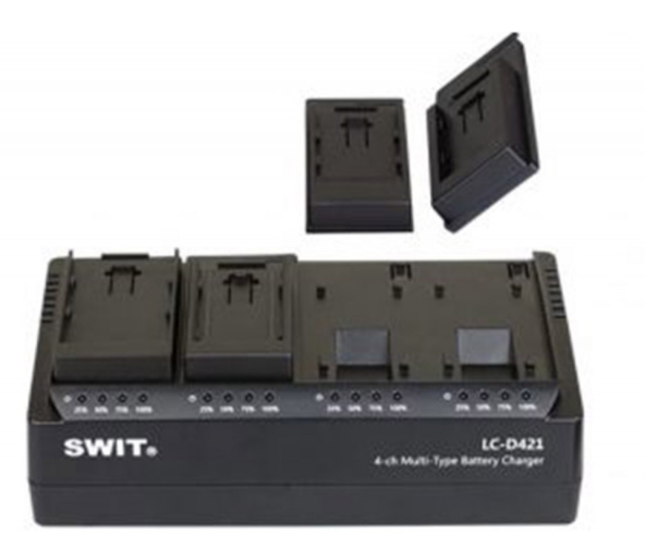 SWIT LC-D421V KIT je profesionalni 4-kanalni DV punjač baterija isporučen s 4× JVC BN-VF pločice. S izlaznom snagom od 2 A po kanalu i LED indikatorima punjenja može istovremeno napuniti do četiri DV baterije u otprilike jednom satu.