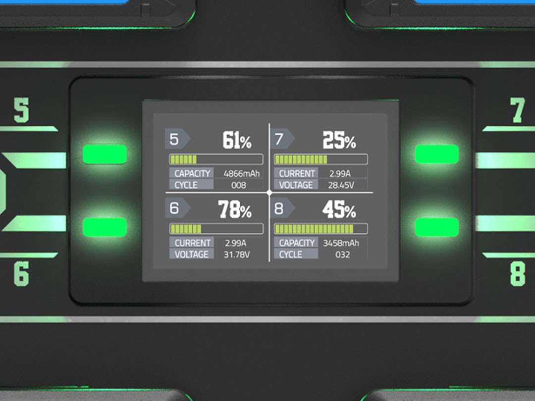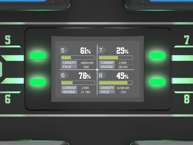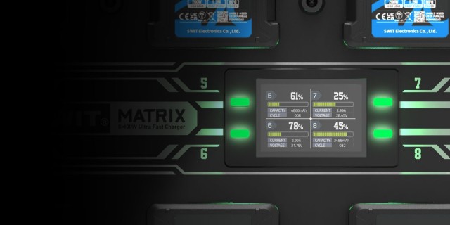 Sveukupno, MATRIX-B8 kombinira visoku učinkovitost punjenja, mogućnost istovremene upotrebe više baterija i fleksibilne mogućnosti instalacije, pozicionirajući ga kao neophodan alat za upravljanje velikim količinama profesionalnih baterijskih paketa s vrhunskim performansama brzog punjenja.