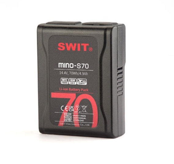 SWIT MINO-S70 džepna V-mount baterija dizajnirana je za moderne kompaktne kamere gdje su veličina, težina i energetska učinkovitost ključni. Sa svojim malim dizajnom koji stane u džep, MINO-S70 idealna je za snimanje iz ruke, ugradnju gimbala i stabilizatora te lagane produkcijske postavke. Unatoč malom prostoru, pruža robusni kapacitet od 70 Wh / 4,9 Ah s konstantnom izlaznom snagom od 100 W / 8 A, sposobna za napajanje visokoučinkovitih kamera poput RED V-RAPTOR-a najmanje jedan sat.